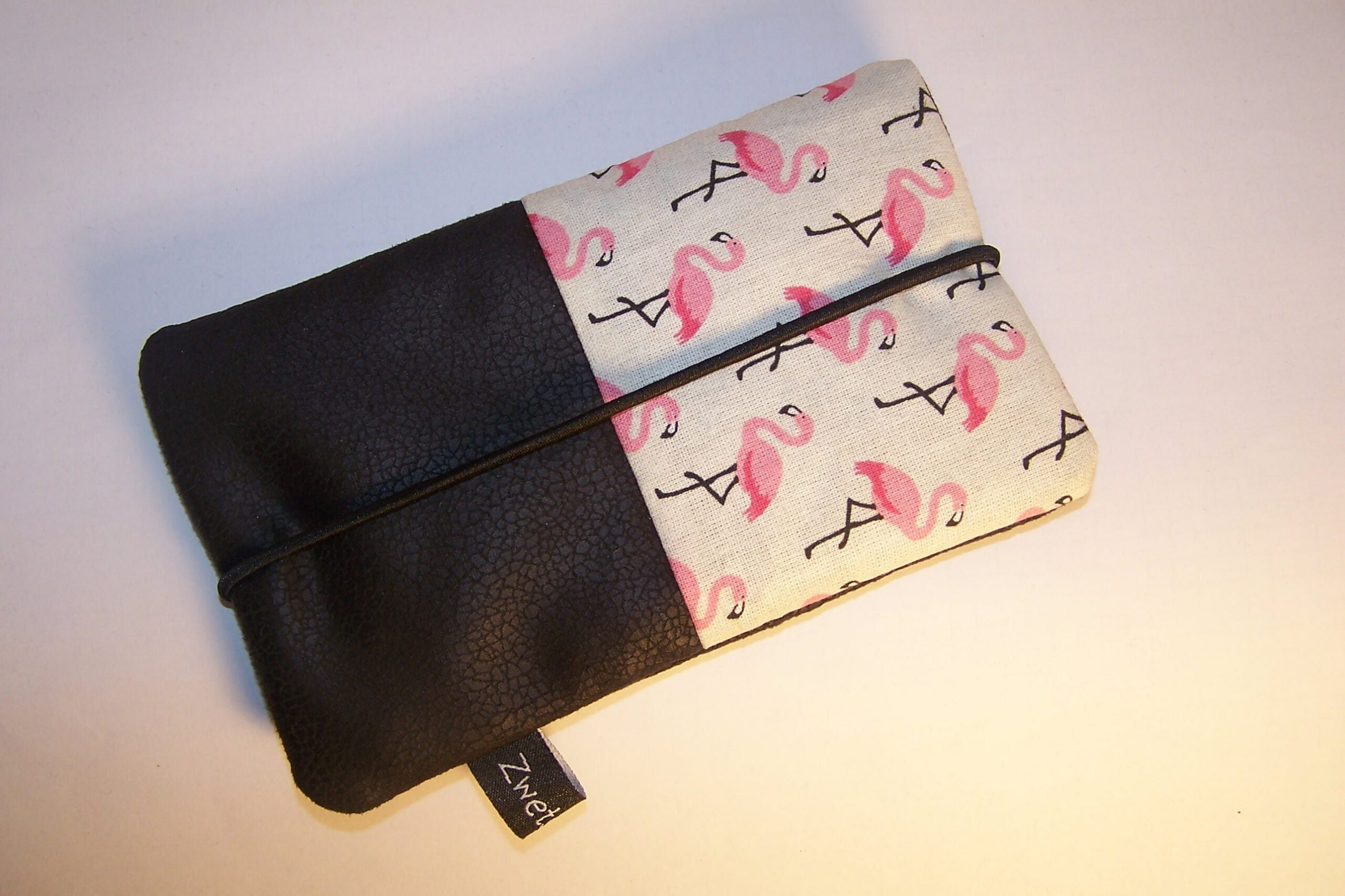 *Tasche für dein Handy oder Smartphone in liebevoller Handarbeit hergestellt!* Der untere Teil dieser trendigen Flamingo Handytasche wurde aus einem wunderschönen, hochwertigen schwarzen Kunstleder genäht.Der obere Bereich, dieses modischen Täschchens, aus einem topaktuellen Flamingostoff in weiß pink und schwarz genäht.Das Innenfutter ist schwarz gehalten. Damit es dein Handy sicher und kuschelig hat, wurde die Tasche mit Volumenvlies gepolstert. Die Tasche wird mit einer Gummikordel passend in schwarz geschlossen, so ist dein Handy sicher und kann nicht rausrutschen.