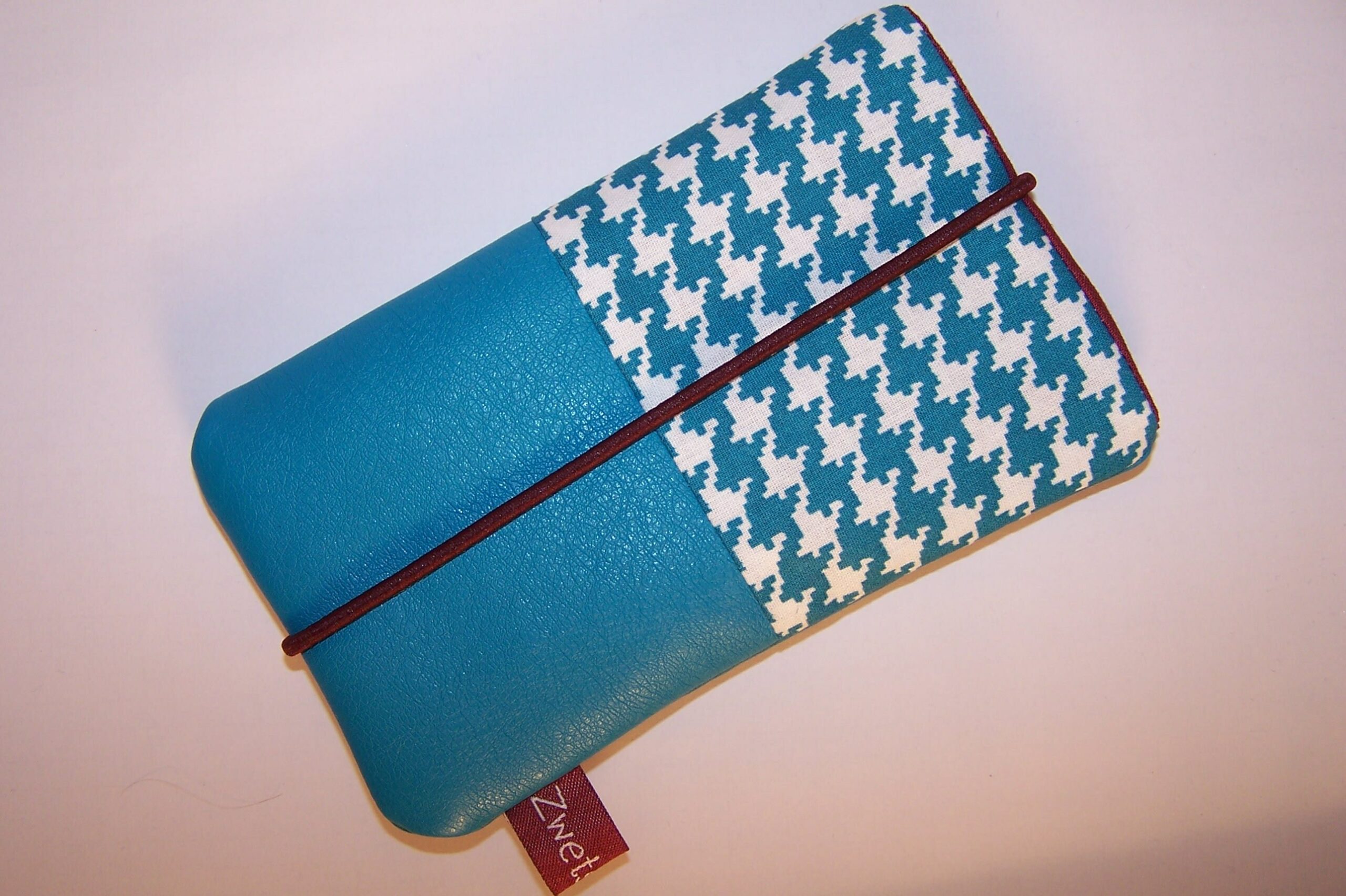 *Tasche für dein Handy oder Smartphone in liebevoller Handarbeit hergestellt!* Der untere Teil dieser edlen, trendigen Handyhülle wurde aus einem sehr hochwertigen Kunstlederstoff in der Trendfarbe kobaltblau genäht.Der obere Bereich, dieses schicken, exclusiven Täschchens ist im Hahnentrittmuster kobaltblau/creme gehalten.Das Innenfutter ist passend in dunkelrot. Damit es dein Handy sicher und kuschelig hat, wurde die Tasche mit Volumenvlies gepolstert. Die Tasche wird mit einer Gummikordel in weinrot geschlossen, so ist dein Handy sicher und kann nicht rausrutschen.