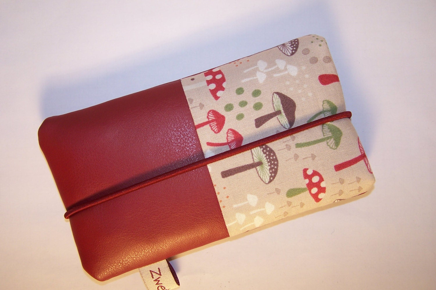 Tasche für dein Handy oder Smartphone in liebevoller Handarbeit hergestellt! Der untere Teil dieser trendigen Punkte-Handyhülle wurde aus einem wunderschönen dunkelroten/weinroten marsalafarbenen Kunstlederstoff genäht.Der obere Bereich, dieses schicken trendigen Täschchens, aus einem topaktuellen süßen Pilzstoff in beige natur.Das Innenfutter ist passend in bordeaux gehalten. Damit es dein Handy sicher und kuschelig hat, wurde die Tasche mit Volumenvlies gepolstert. Die Tasche wird mit einer Gummikordel in dunkelrot geschlossen, so ist dein Handy sicher und kann nicht rausrutschen.