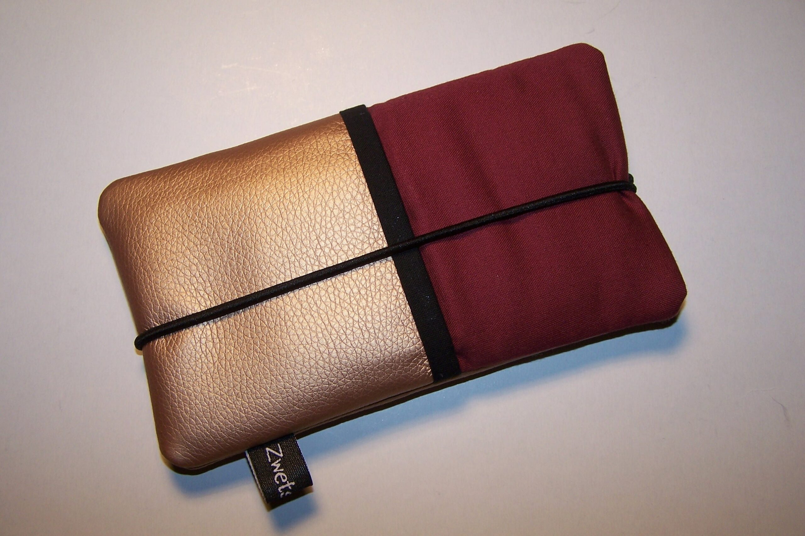 Diese stylische, edle Handytasche ist aus hochwertigem Kunstleder- und Baumwollstoff gefertigt. Die Tasche ist mit Vlies gefüttert und dadurch wunderbar gepolstert und schützt dein Handy perfekt. Geschlossen wird sie mit einer Gummikordel.