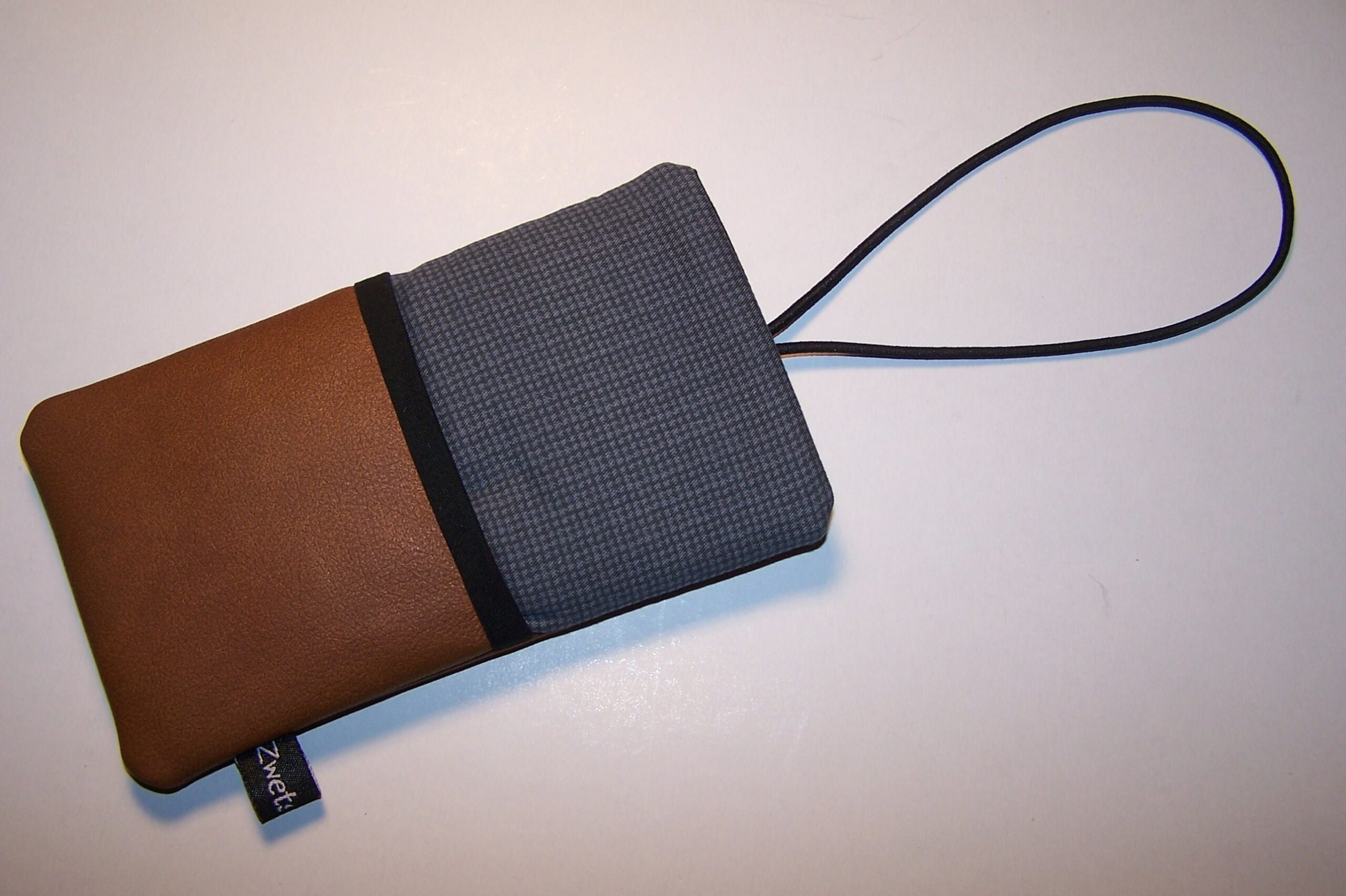 Diese stylische, edle Handytasche ist aus hochwertigem Kunstleder- und Baumwollstoff gefertigt. Die Tasche ist mit Vlies gefüttert und dadurch wunderbar gepolstert und schützt dein Handy perfekt. Geschlossen wird sie mit einer Gummikordel.
