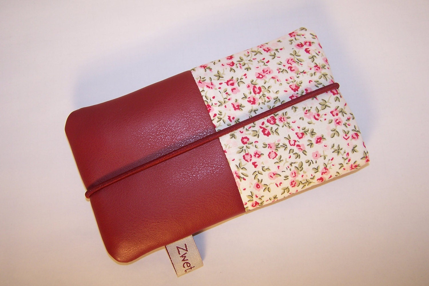 Tasche für dein Handy oder Smartphone in liebevoller Handarbeit hergestellt! Der untere Teil dieser trendigen frischen millefleurs Handyhülle wurde aus einem wunderschönen dunkelroten Kunstlederstoff genäht.Der obere Bereich, dieses frischen geblümten Täschchens, aus einem topaktuellen millefleurs Streublumen Stoff in rose auf weißem Grund.Das Innenfutter ist passend in dunkelrot weinrot gehalten. Damit es dein Handy sicher und kuschelig hat, wurde die Tasche mit Volumenvlies gepolstert. Die Tasche wird mit einer Gummikordel in dunkelrot geschlossen, so ist dein Handy sicher und kann nicht rausrutschen.