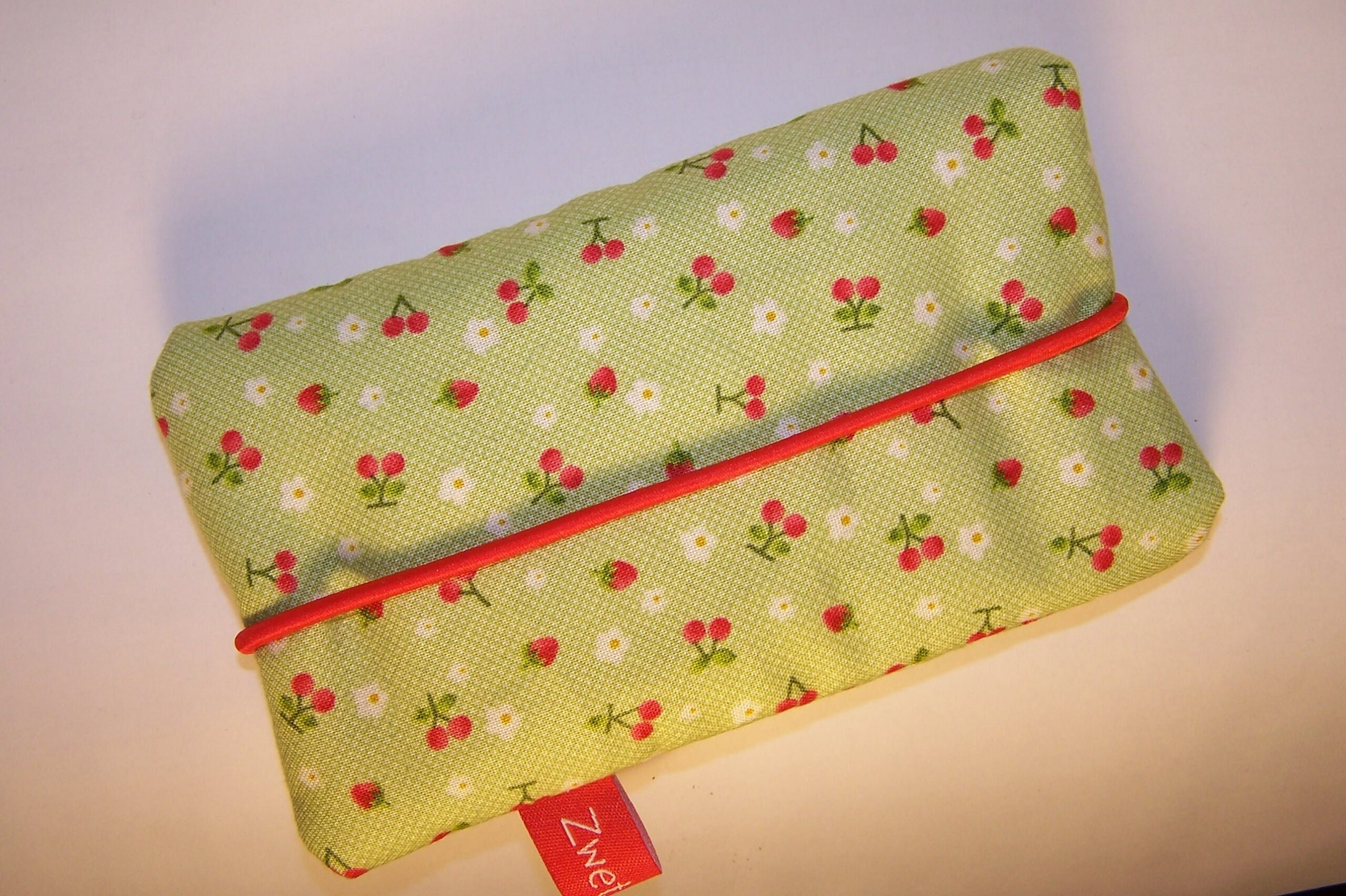 Handytasche süßes Früchtchen!Aus einem traumhaften Früchtestoff in hellem grün mit kleinen Kirschen, Erdbeeren, zarten Blümchen und einem gepunkteten Innenfutter in rotweiß.