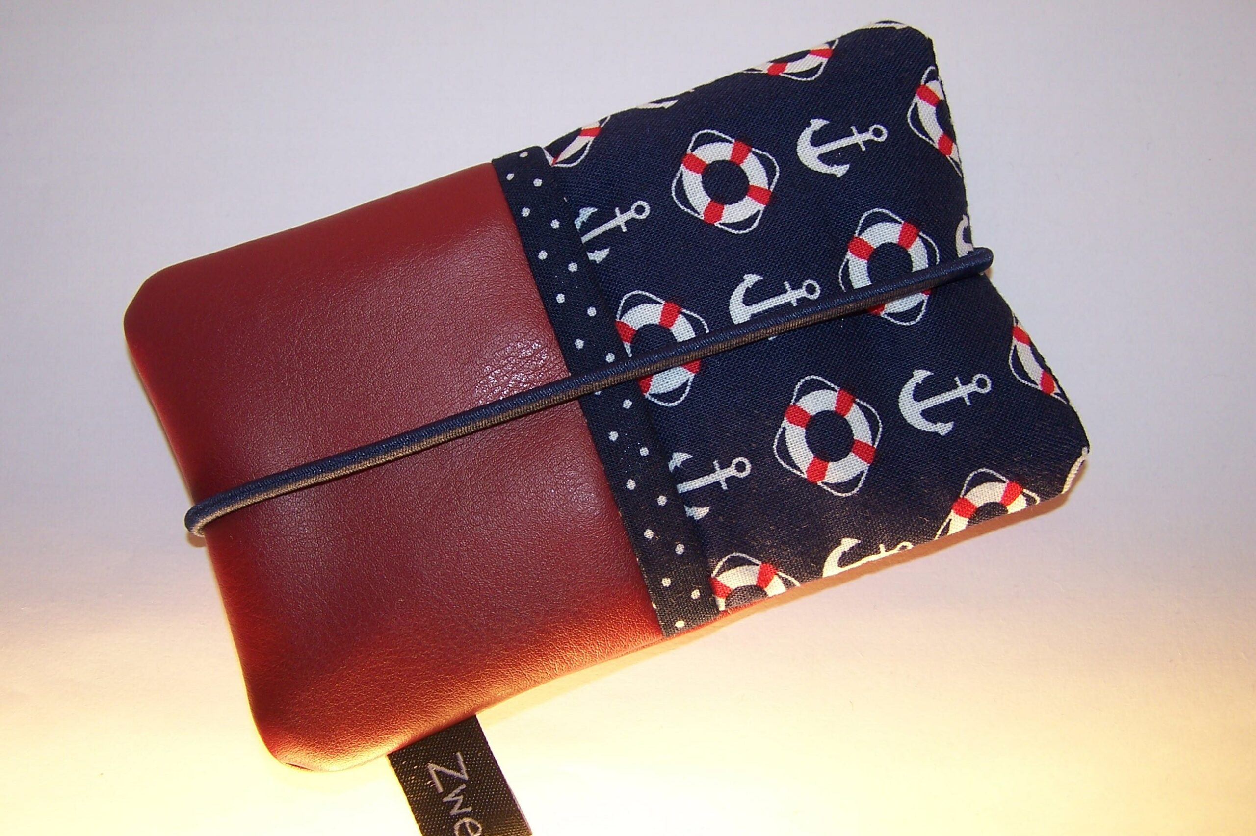 *Tasche für dein Handy oder Smartphone in liebevoller Handarbeit hergestellt!* Der untere Teil dieser trendigen Maritimen-Handyhülle wurde aus einem wunderschönen dunkelroten/weinroten marsalafarbenen Kunstlederstoff genäht.Der obere Bereich, dieses schicken trendigen Täschchens, aus einem topaktuellen Maritimen Design mit Anker und Rettungsring in dunkelblau weiß und rot.Das Innenfutter ist passend in dunkelblau mit weißen kleinen Punkten gehalten. Damit es dein Handy sicher und kuschelig hat, wurde die Tasche mit Volumenvlies gepolstert. Die Tasche wird mit einer Gummikordel in dunkelblau geschlossen, so ist dein Handy sicher und kann nicht rausrutschen.Das Täschchen hat zusätzlich vorne ein kleines Fach für deine Kopfhörer oder Sonstiges, unterlegt mit dem Innenfutterstoff der oben schön als Borte herausspitzt,aufgenäht.