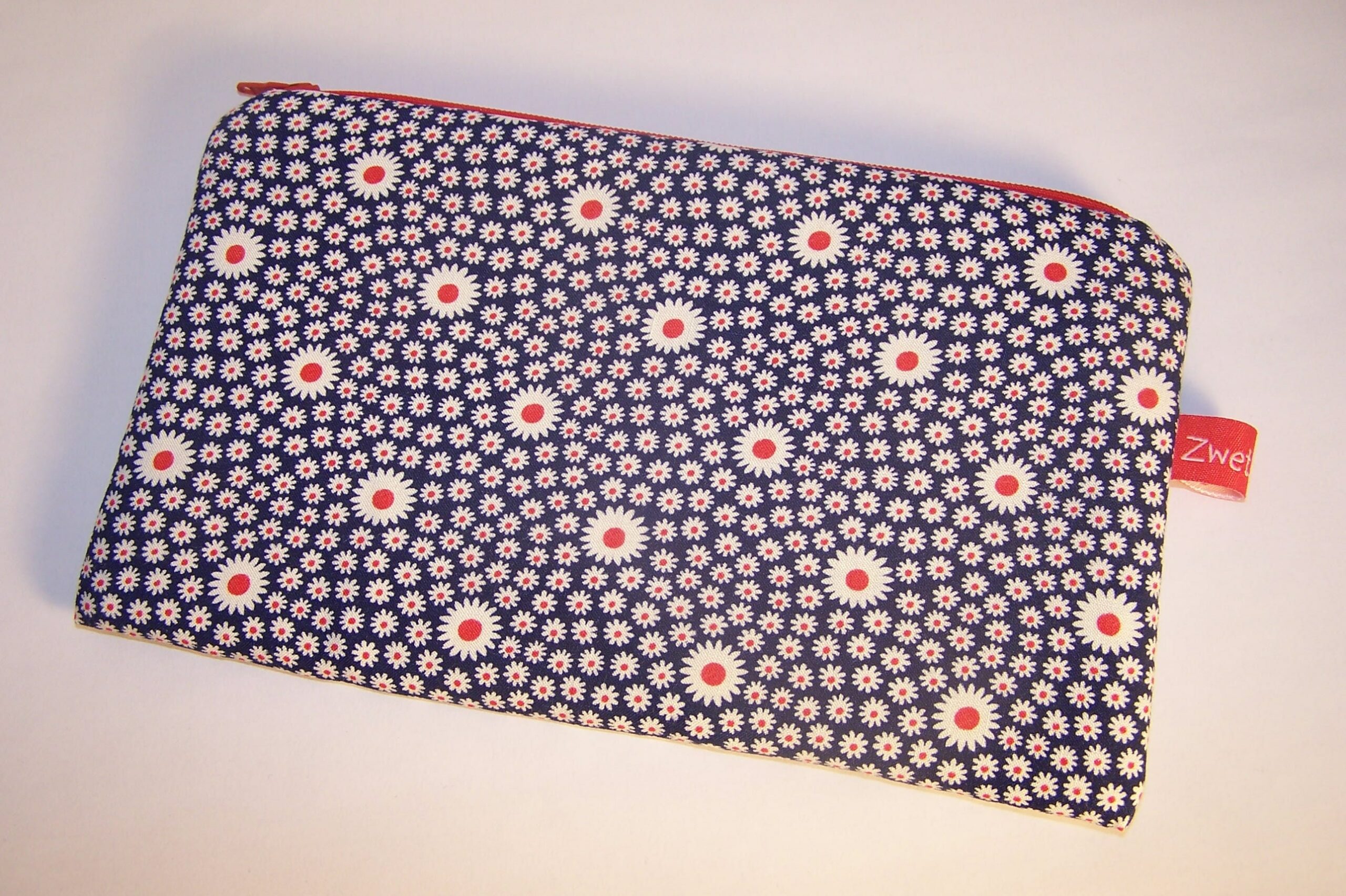 Wunderschöne Kosmetiktasche mit Blumen in dunkelblau, weiß, rot. Das Schminktäschchen ist aus einem sehr hochwertigen Baumwollstoff mit vintage retro Flower Druck genäht.Dieses Täschchen ist ganz besonders, da es romantisch aber auch cool ist und der Druck auffällt, aber auch dezent und edel ist. Das Innenfutter ist aus rotem Baumwollstoff und passt perfekt zu dieser chicen, edlen Tasche. Selbstverständlich ist auch der Reißverschluß in rot, genau auf den Blumen Look farblich abgestimmt.