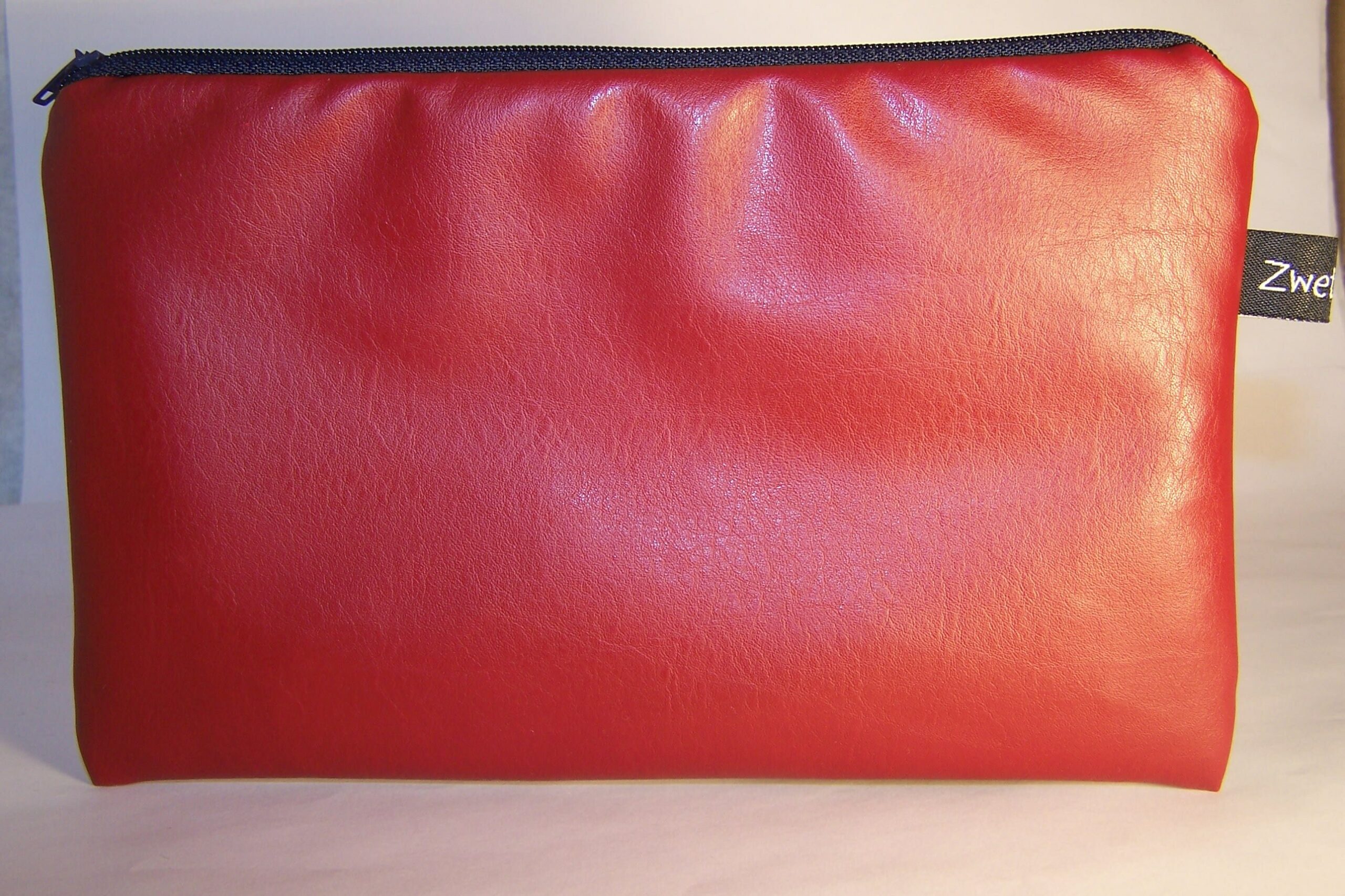 Edle schlichte Kosmetiktasche. Das Schminktäschchen ist aus einem sehr hochwertigen Kunstleder in dunkelrot genäht.Das Innenfutter ist dunkelblau mit kleinen weißen Punkten und rundet so perfekt diese schicke Tasche ab. Selbstverständlich ist auch der Reißverschluss in dunkelblau genau passend auf diese wunderschöne weinrote Farbe abgestimmt.